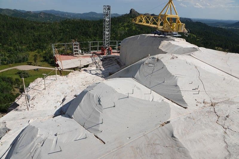 Focus has turned to finish work on the outstretched arm and hand of Crazy Horse along with the Horse's Mane. A pointing boom was installed in late 2014 to allow for precise measuring. Most of the work that will continue in this area of the Mountain will be done by hand.