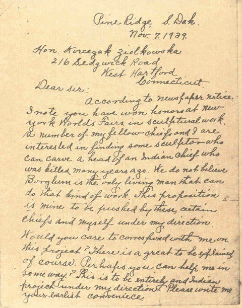 Learning of Korczak's success at the New York World's Fair, Chief Henry Standing Bear writes a letter asking for Korczak's assistance in building a monument for Native Americans.