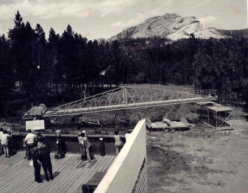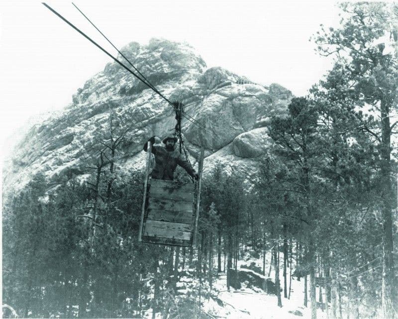 Korczak starts to cut for the 90 foot tall profile of Crazy Horse's face. He uses "the bucket" aerial cable car run by an antique Chevy engine working to haul equipment and tools to the top of the Mountain.