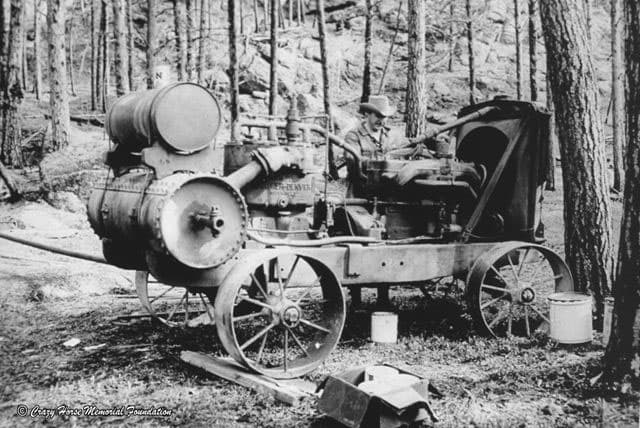 Work begins on the Mountain with a horizontal cut under the Horse's Mane. The Sculptor works alone with one small jackhammer powered by a gas compressor ("Old Buda") at the bottom of the Mountain.